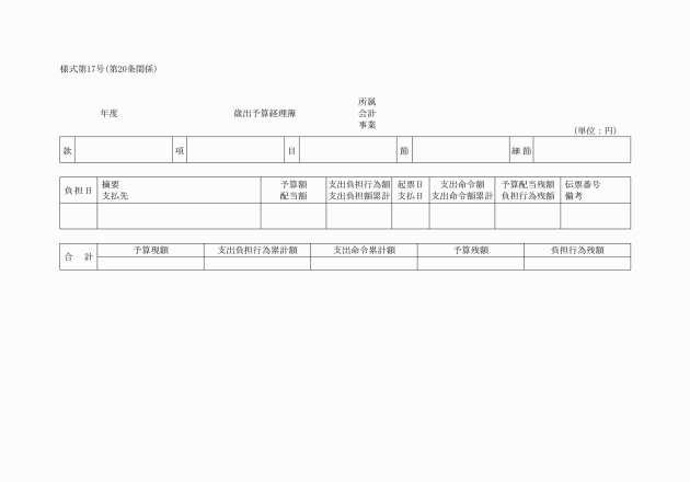 第20条 総務部長は、歳入歳出予算現計簿(様式第16号)を備え、常に歳入歳出予算の増減を整理しなければならない。