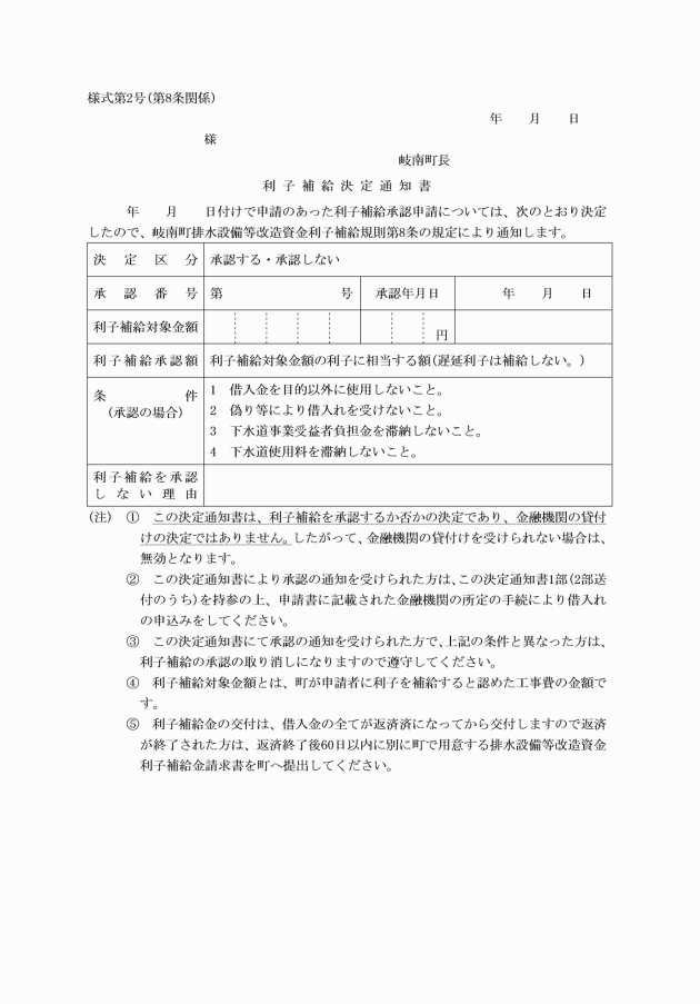 第12条 利子補給金の請求をしようとする者は、借入金償還終了後60日以内に排水設備等改造資金利子補給金請求書(様式第5号)により町長に請求するものとする。