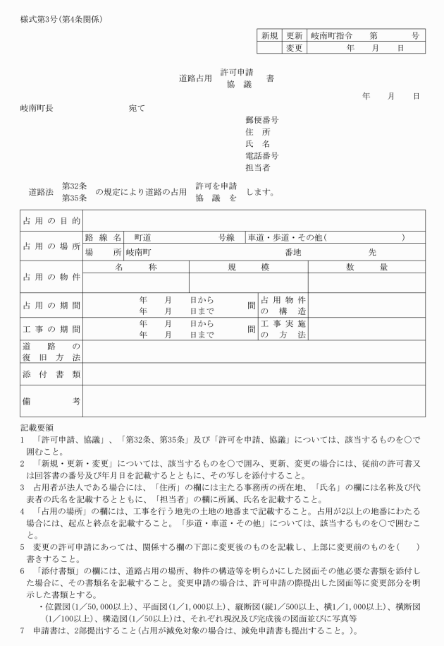3 法第32条第1項の許可を受けた者又は法第35条の同意を得た者(以下「道路占用者」という。)が、当該占用許可を受けた事項を変更するために、更に占用の許可を受けようとする場合は、あらかじめ道路占用許可申請書又は道路占用協議書に変更に係る書類を添えて町長に提出しなければならない。