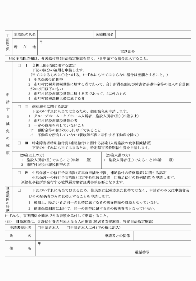 第4条 施行規則第21条の規定による施設訓練等支援費の支給申請は、施設訓練等支援費支給申請書兼利用者負担額減額・免除等申請書(様式第2号)により行うものとする。