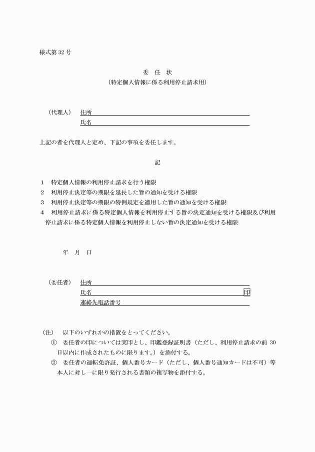 32 | 委任状(特定個人情報に係る利用停止請求用) | 令第29条において準用する令第22条第3項 | |